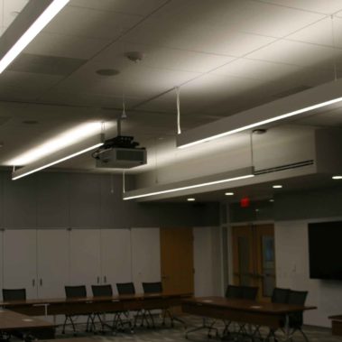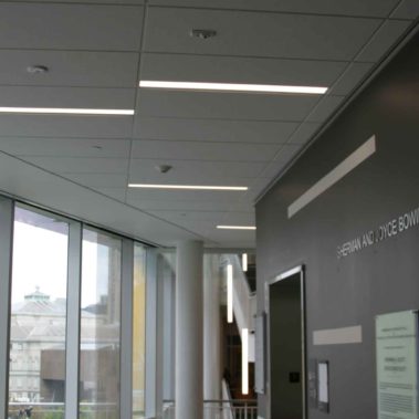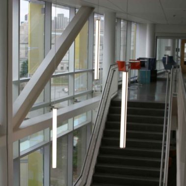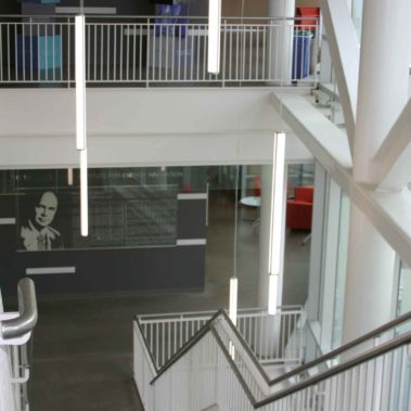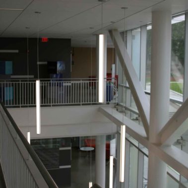 Built on 13 exterior steel columns, the building spans 3 stories and connects many disciplines. In keeping with CMU’s sustainability initiative, Pinnacle Edge fixtures line the entryway of the hall and lead students to the labs, along with Elite down lights. A variety of fixtures have been chosen to light the clean rooms, labs, and conference rooms, rounding out the interior lighting. Wattstopper’s DLM fully networked integrated lighting control system was installed to control the various lighting fixtures installed.