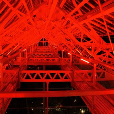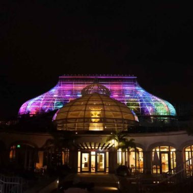 Color changing lights utilize two levels of lighting, a lower and upper ring. The lower ring utilizes 32 Color Kinetics Colorgraze QLX 4’ fixtures. The upper ring utilizes 16 Color Kinetics Colorgraze EC 4’ fixtures. All fixtures are being controlled with a Color Kinetics Iplayer3. The project demanded a high level of granularity, so each 4’ fixture was set up to change color every 12 inches of the fixture. Besides several static color looks, there are also several displays that have a rainbow of light slowly moving around the dome.