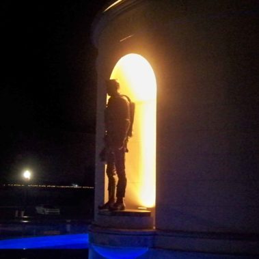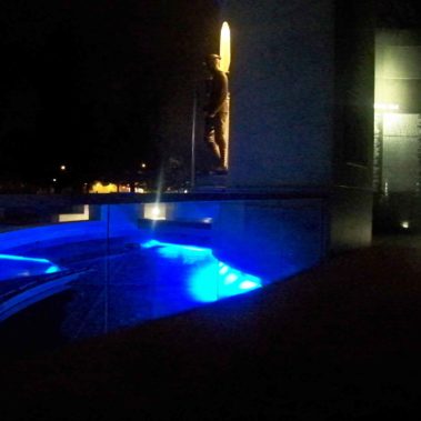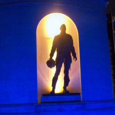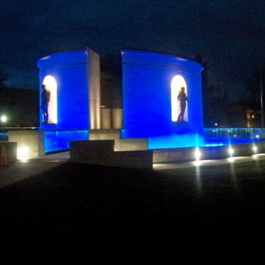 The West Virginia Veterans Memorial is a two-story oval shaped monument honoring more than 10,000 West Virginians who made the ultimate sacrifice in defending the nation in twentieth century conflicts. Composed of four limestone monoliths surrounded by a reflecting pool, the interior walls are faced in polished black granite etched with the names of these men and women. The Memorial was designed by P. Joseph Mullins, who also sculpted the four figures representing the four major twentieth century conflicts and the four major branches of military service